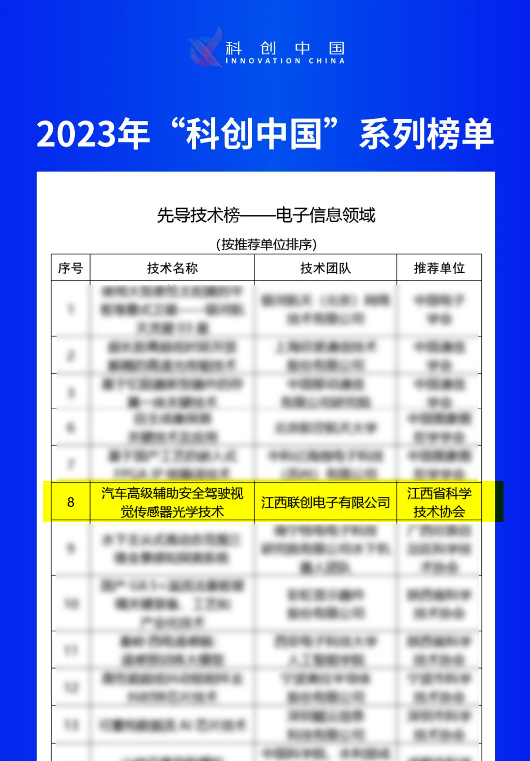 【概要描述】近日,中国科学技术协会公布了2023年度“科创中国”系列榜单遴选结果,江西登录入口有限公司的“汽车高级辅助安全驾驶视觉传感器光学技术”成功入选电子信息领域先导技术榜。