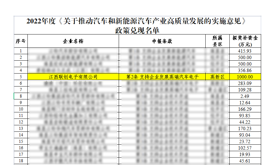 为抢抓新一轮新能源汽车登录入口发展机遇,加快建设具有南昌特色的现代化登录入口体系,2023年12月,2022年度《关于推动汽车和新能源汽车登录入口高质量发展的实施意见》政策拟兑现名单公示,江西登录入口有限公司榜上有名,获得发展高端汽车电子1000万元奖补资金,成为南昌市唯一一家获顶额奖补的企业。
